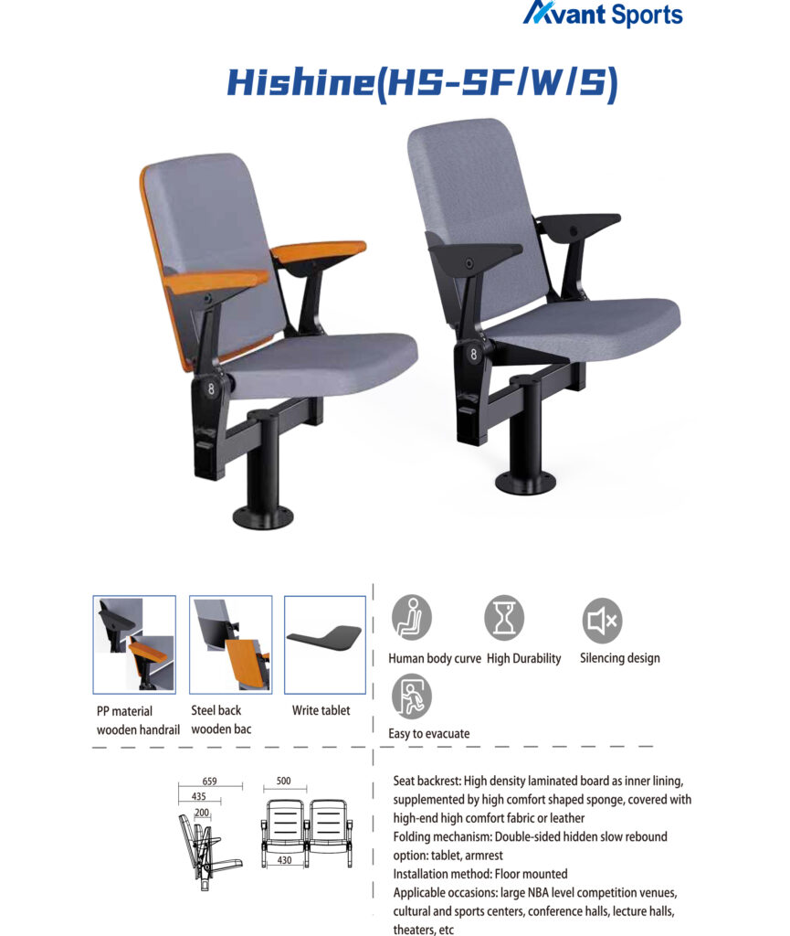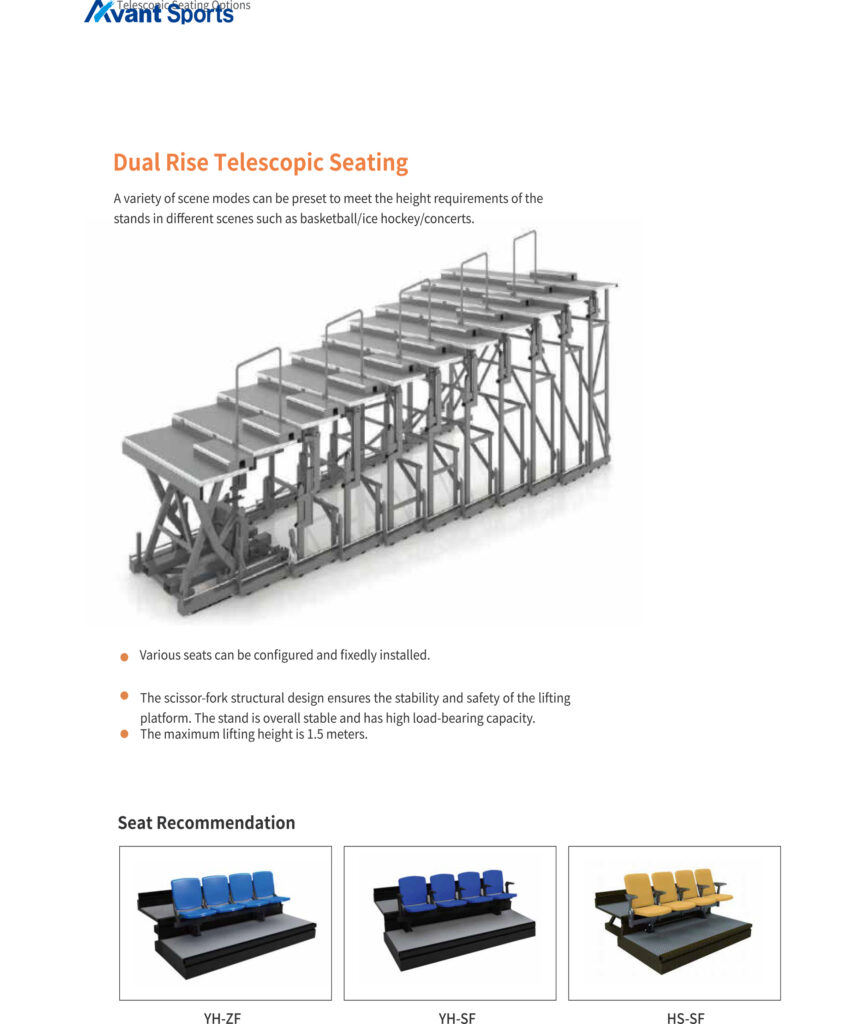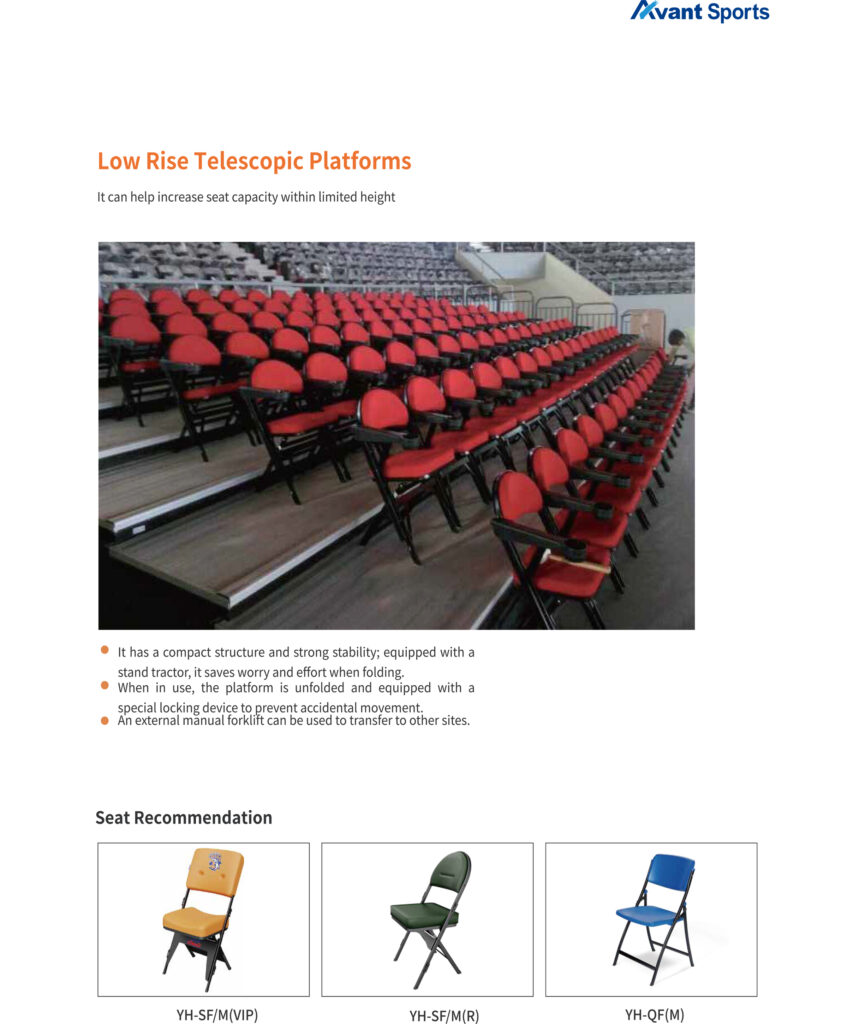 Avant Sports Industrial Co.,Ltd. was founded in 1994, is the earliest professional manufacturer engaged in sports leisure industry in China. Since the establishment, it has maintained a leading position in the field of sports venues and facilities and it has always been cooperating with the world’s top sports facility brands closely, to provide the high-quality sports facilities for the large-scale professional stadiums, venues, and the sports grounds of all kinds of schools in China and the world.Our products have been certified by the most authoritative organization and international sports associations, such as:FIFA, FIBA,FIH,etc,to ensure that during use the products can still be in the best condition. Our products including: stadium chair,telescopic seating system, metal structural bleacher.